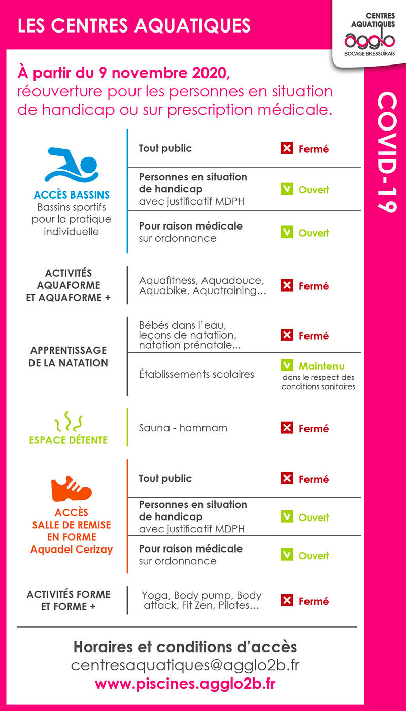 Les centres aquatiques seront également ouverts pour des pratiques sportives individuelles non encadrées, aux usagers bénéficiant d’une prescription médicale ou porteurs de handicap reconnus par la Maison Départementale des Personnes Handicapées (MDPH) à compter du lundi 9 novembre sur des créneaux dédiés sans réservation (voir ci-dessous). Ceci afin de permettre une activité physique adaptée indispensable à ces publics.