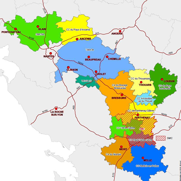 * CC du Pays d'Ancenis, SMCNA, Valor 3E, CC Airvaudais-Val du Thouet, Agglomération du Bocage Bressuirais, CC Mellois en Poitou, Communauté d'Agglomération de Niort, CC Parthenay-Gâtine, CC du Thouarsais, CC Val de Gâtine, CC Haut Val de Sèvre et Sud Gâtine, CC Pays Loudunais, Trivalis.