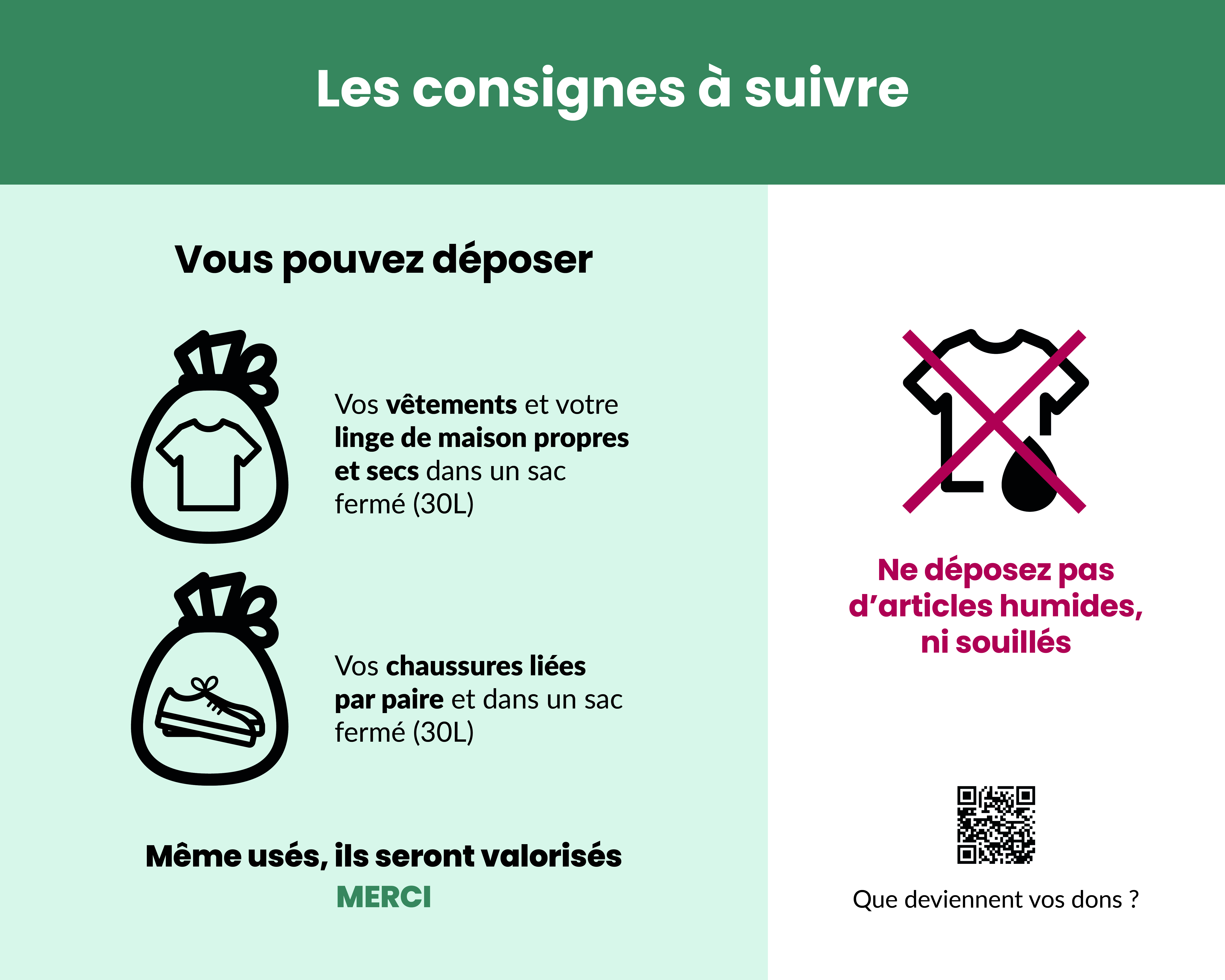 Tous les textiles d'habillement, linge de maison et chaussures usagés peuvent être rapportés, quel que soit leur état, même abîmés. Ils doivent être placés propres et secs, les chaussures liées par paire, dans des sacs fermés.