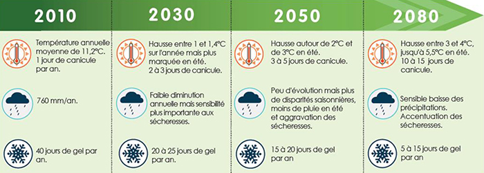 A partir des résultats d’une étude régionalisée du GIEC avec différents scénarios, les grandes tendances ainsi que les impacts attendus, les enjeux et les points de vigilance du territoire ont été simplifiés et synthétisés dans la frise suivante.