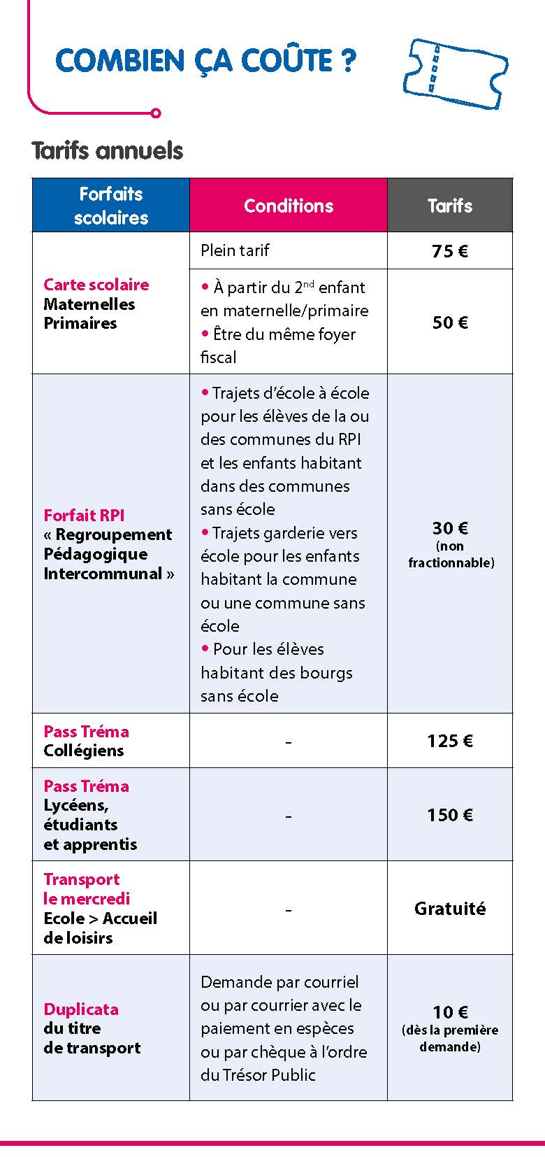 Les tarifs de transports sont divisibles par trimestre, hormis le forfait à 30 € pour le RPI.