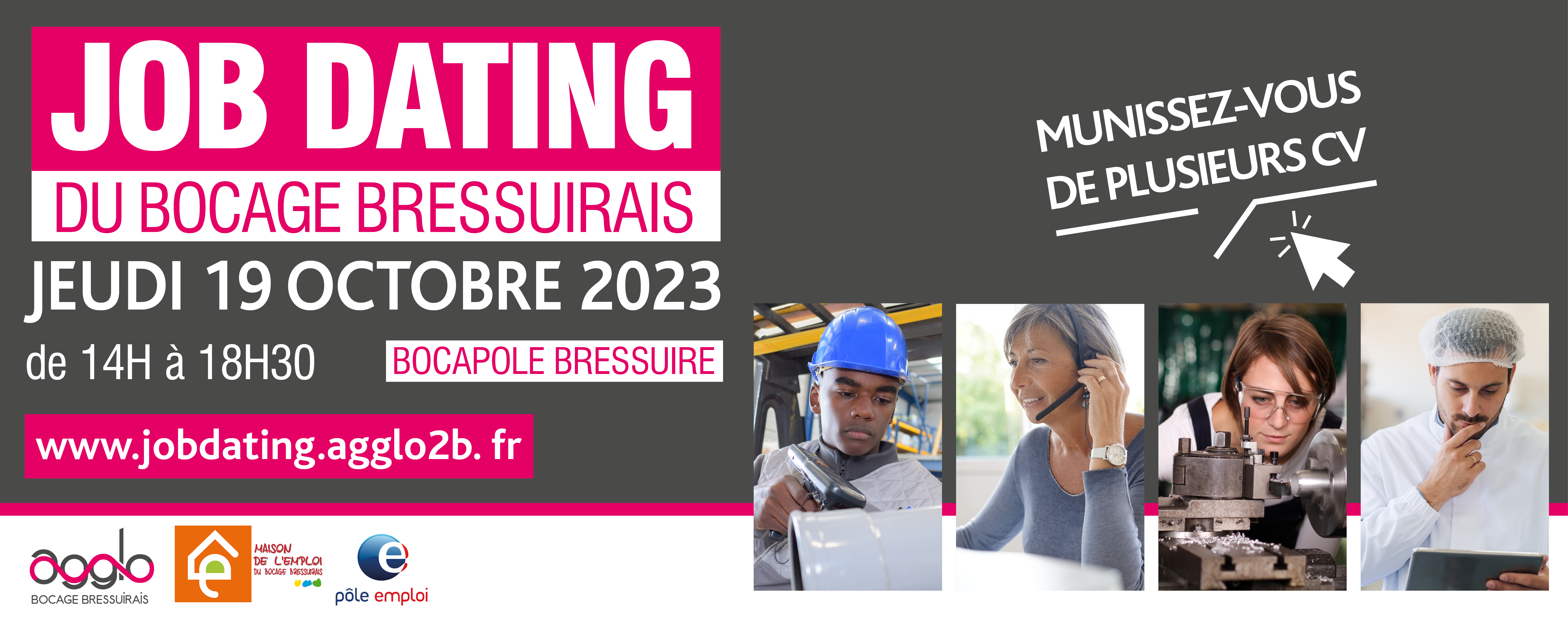 Jeudi 19 octobre 2023 à Bocapole Bressuire, se tiendra le Job Dating du Bocage Bressuirais, un rendez-vous pour l’emploi coorganisé par l’Agglomération du Bocage Bressuirais, Pôle Emploi et la Maison de l’Emploi.