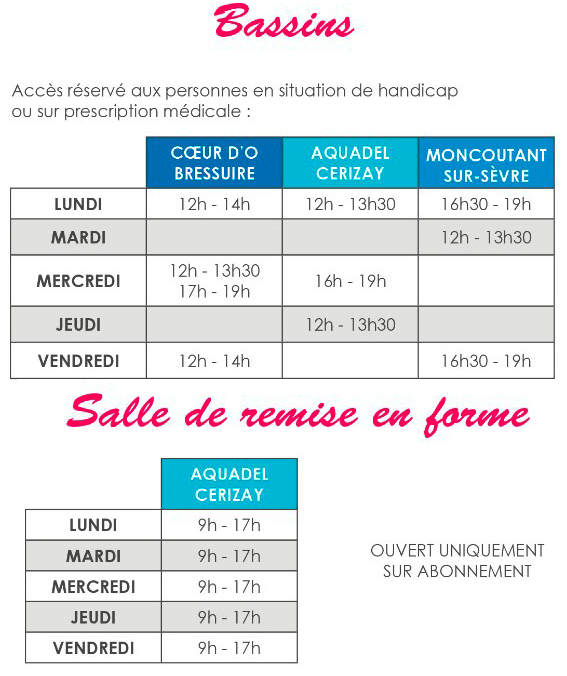Les centres aquatiques Cœur d’O de Bressuire, Aquadel de Cerizay et le centre aquatique de Moncoutant-sur-Sèvre réouvrent donc comme suit :
