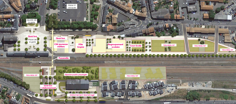 Pour permettre les correspondances scolaires entre le boulevard Clémenceau et le boulevard du Maréchal Foch, une passerelle sera construite au-dessus des voies ferrées. Elle reliera la Place St Jacques à la gare de fret et sera équipée d’un ascenseur de chaque côté.