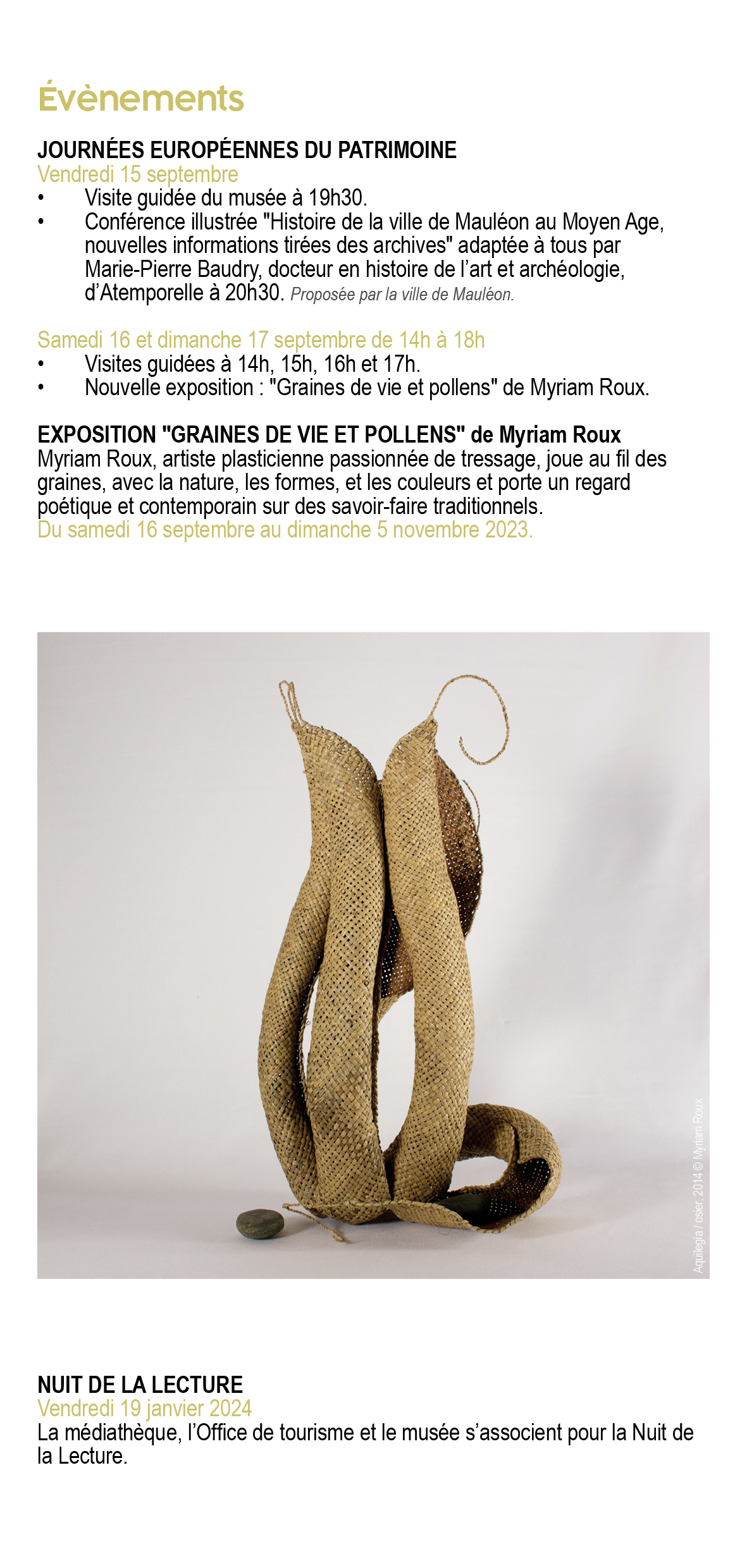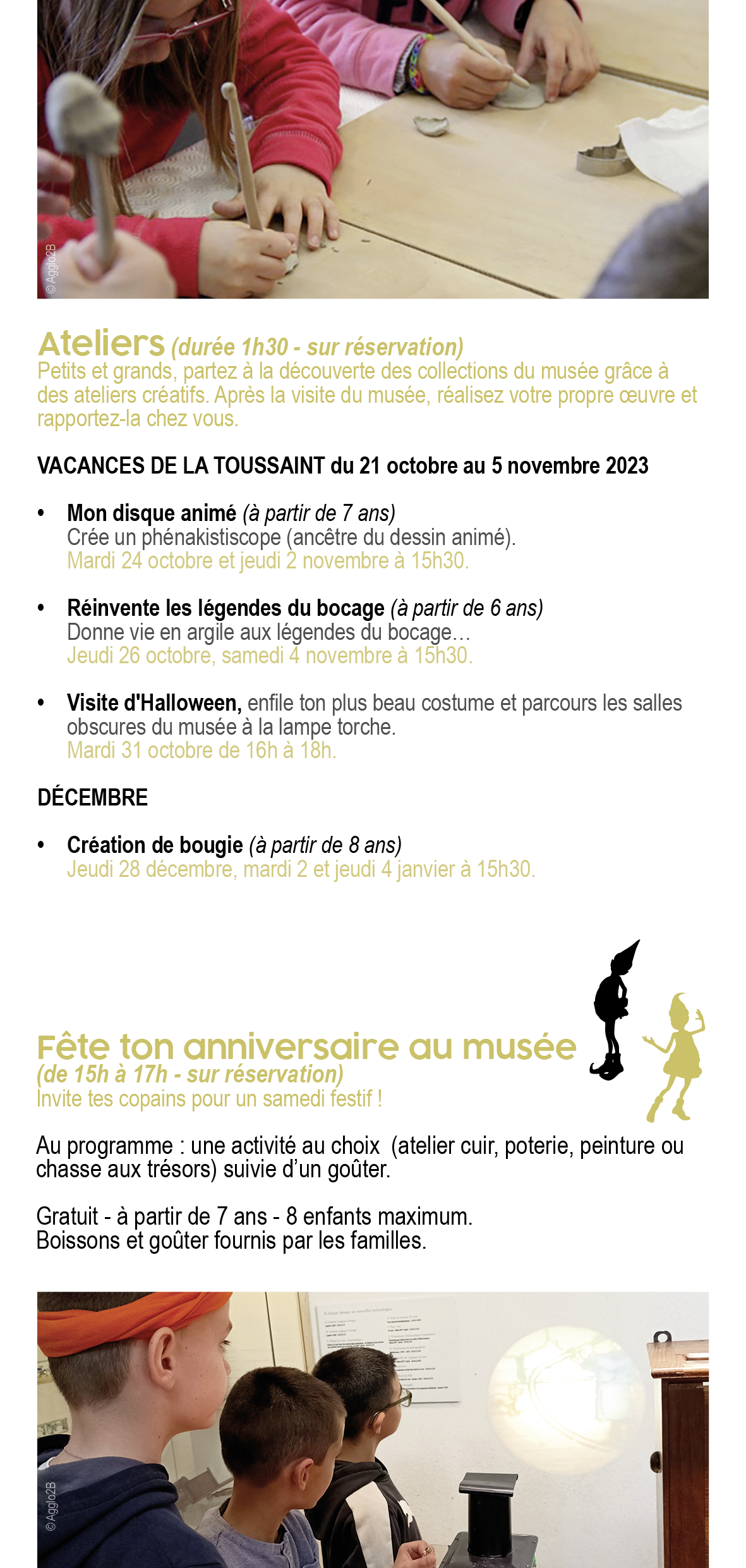 Une salle attenante, à l’ambiance feutrée, évoque la culture populaire en bocage (contes, chants, musiques) et l’écrivain emblématique Ernest Pérochon. La visite se poursuit au 1er étage avec 4 espaces, retraçant l’histoire du Mauléonais du Moyen-Age jusqu’aux Guerres de Vendée, puis l’industrialisation du XIXème siècle mettant en valeur nombres d’outils utilisés à l’époque. La chapelle attire très vite tous les regards… On y découvre l’histoire religieuse avec de précieuses pièces d’orfèvrerie, mais aussi les légendes et croyances. Et comme un clin d’oeil au passé, la visite se termine avec l’atelier du cirier et les nouvelles technologies… du XIXème siècle.